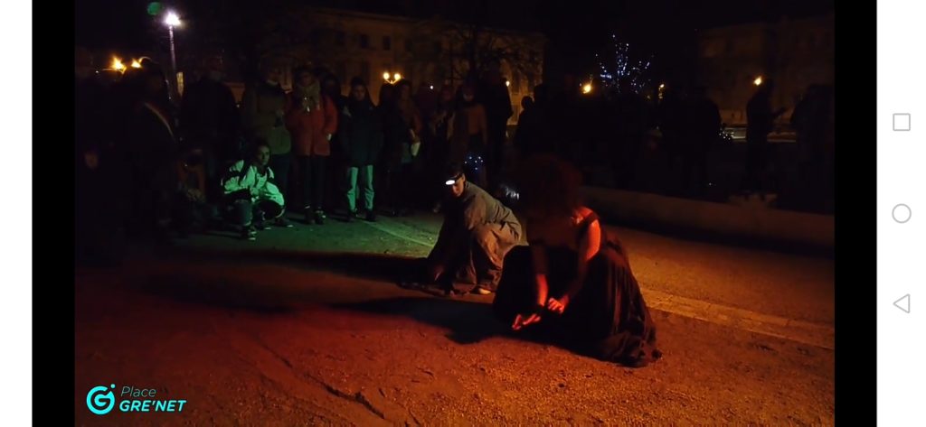 Quatre créatures entre chien et loup, entre femme et fantôme, ombres légères effleurant le sol, frôlent nos consciences, inspectent nos états d’âme, questionnent nos cauchemars, nos non-dits, non-vécus. Quatre créatures, miroirs sans teint de nos boites mentales arpentent la voix publique pour un partage spatial, visuel, physique et psychique de la société pagaille et laborieuse, diverse, bigarrée, hasardeuse, politique ou chaque âme qui passe est une histoire qui laisse une traîne et s’emmêle à celle des autres.